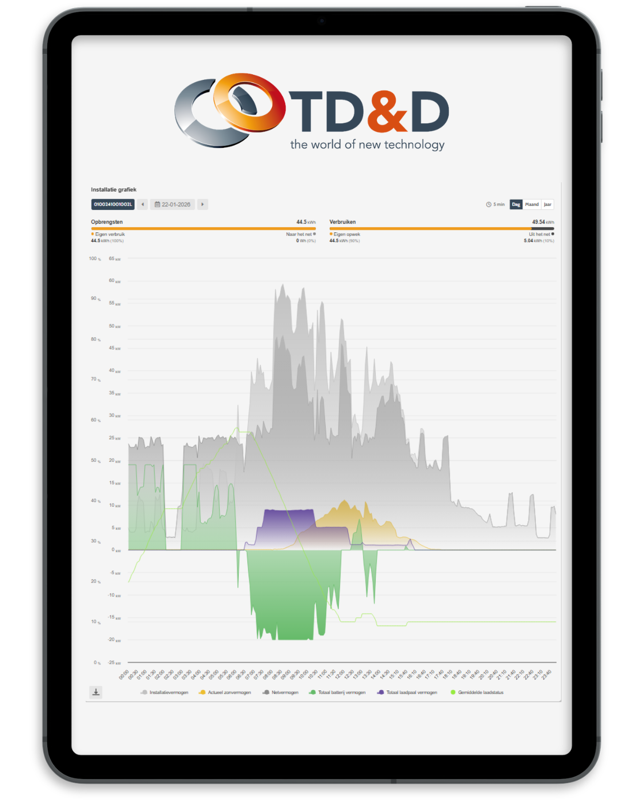 Het Energy Management System (EMS) van TD&D koppelt accu’s, laadpalen, zonnepanelen en energiecontracten. Het stuurt alles slim aan, zodat uw klant altijd optimaal gebruikmaakt van zijn energiecapaciteit.